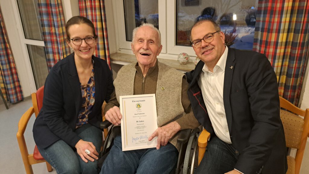 Josef Schweter aus dem Imkerverein Hildesheim wurde am 29.01.2026 für ein halbes Jahrhundert aktive Vereinsmitgliedschaft geehrt. Bei Kaffee und Kuchen überreichten ihm die Vereinsvorsitzenden Nico Ehlers und Simone Wiemuth die Ehrenurkunde und bedankten sich für fünf Jahrzehnte mitwirken im Verein.
